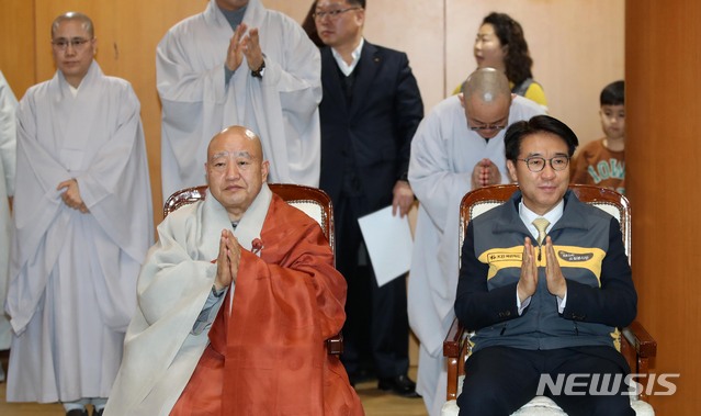【서울=뉴시스】 고범준 기자 = 19일 오후 서울 종로구 불교역사문화기념관에서 열린 'KB국민카드와 아름다운동행이 함께하는 2019학년 책가방보내기'행사에서 조계종 총무원장 원행 스님(아름다운동행 이사장)과 이동철 KB국민카드 사장이 참석자 소개에 박수를 치고 있다. 2019.02.20.
