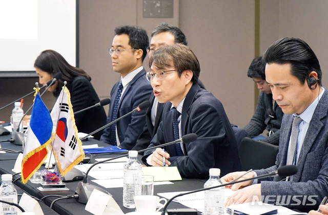 【서울=뉴시스】박미소 수습기자 = 노건기(오른쪽 두번째) 산업통상자원부 통상정책국장이 19일 오후 서울 서초구 JW메리어트호텔에서 열린 '제17차 한-프랑스 산업협력위원회'에서 인사말을 하고 있다.