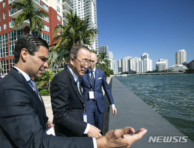 【마이애미=AP/뉴시스】반기문(가운데)전 유엔사무총장이 19일(현지시간) 미 플로리다주 마이애미를 방문해 마이애미의 해수면 상승 대응 방안 등을 살피며 프란시스 수아레스 마이애미 시장의 설명을 듣고 있다. 2019.02.20.