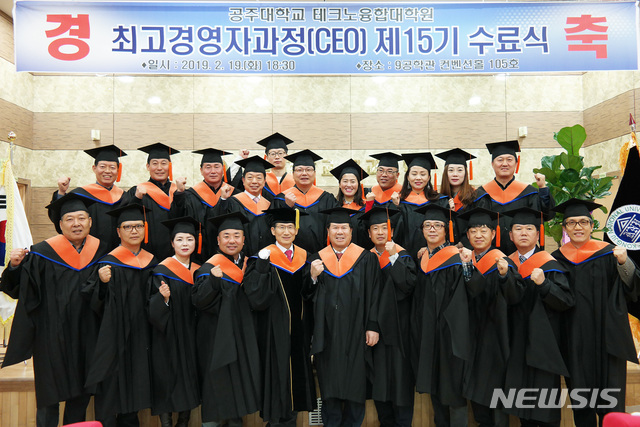 【공주=뉴시스】유순상 기자 = 19일 공주대 천안캠퍼스에서 열린 테크노융합대학원 최고경영자(CEO)과정 제15기 수료식에서 참석자들이 기념촬영을 하고 있다. 개인사업자와 공공기관 등의 근무자들로 인문학과 창조경영, 건강관리, 커뮤니케이션 스킬, 경영철학 등 다양한 교육과정을 이수했다. 2019.02.20.(사진=공주대 제공)