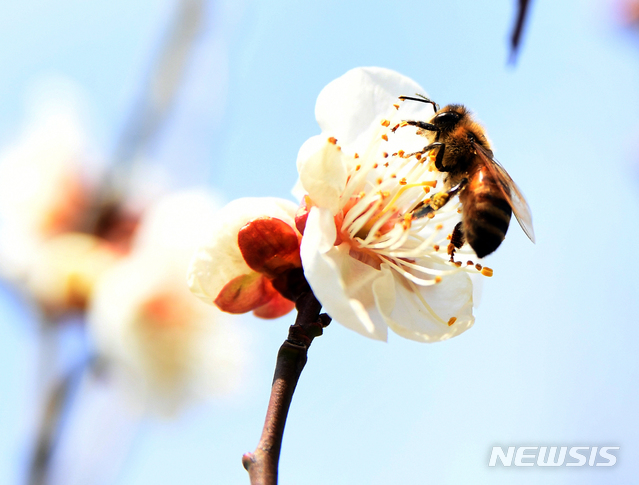【남해=뉴시스】차용현 기자 = 포근한 날씨를 보이고 있는 20일 오후 경남 남해군 남해읍 인근 들녘에서 꿀벌 한 마리가 활짝 꽃망울을 터뜨린 매화에 앉아 꿀을 따고 있다. 2019.02.20.