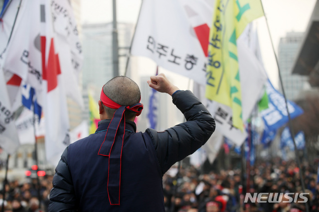 【서울=뉴시스】박미소 수습기자 = 김명환 전국민주노동조합총연맹 위원장이 20일 오후 서울 종로구 세종로소공원에서 열린 '민주노총 결의대회'에서 청와대로 행진하기 전 구호를 외치고 있다. 2019.02.20.