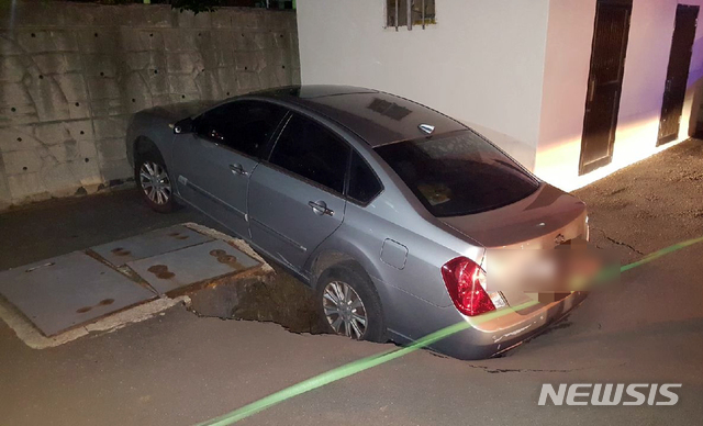 【부산=뉴시스】 하경민 기자 = 20일 오후 8시 36분께 부산 연제구의 한 빌라 뒤 주차장에서 지름 2.5m, 깊이 3m 크기의 싱크홀이 발생, 주차차량(SM5)의 뒷부분이 빠졌다. 2019.02.21. (사진=부산경찰청 제공)