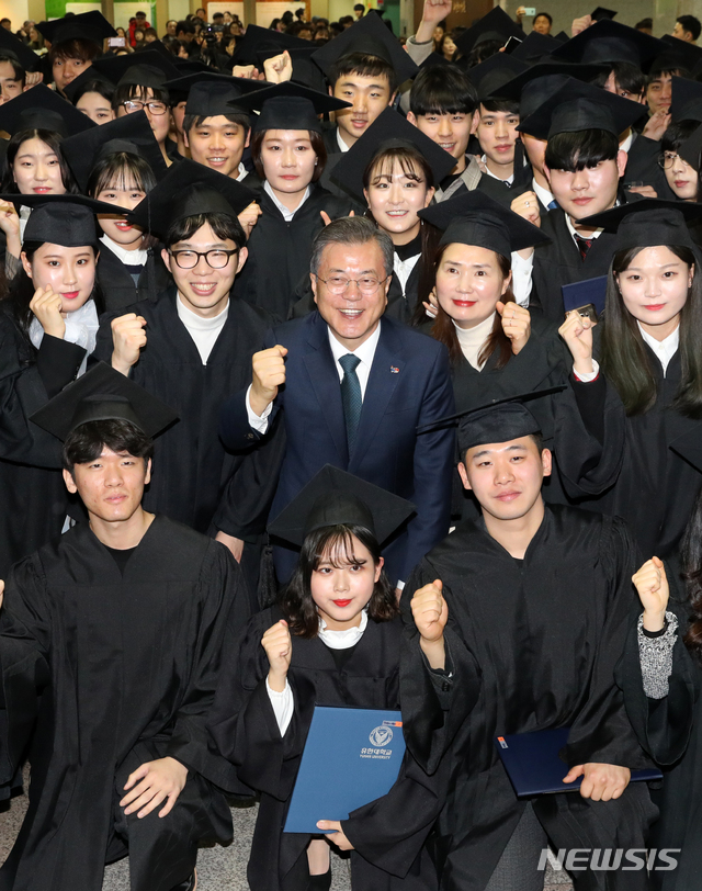 【부천=뉴시스】박진희 기자 = 문재인 대통령이 21일 경기도 부천 유한대학교에서 열린 2018 학위수여식을 마친 후 졸업생들과 기념촬영하고 있다. 2019.02.21.