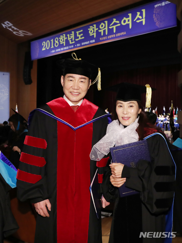 【서울=뉴시스】조수정 기자 = 22일 오전 서울 홍지동 상명대학교에서 열린 2018학년도 학위수여식에서 박사학위를 받은 배우 박상원(디지털이미지학과)과 가수 장혜진(공연예술경영학과.오른쪽)이 학위기를 받은 뒤 기념촬영 하고 있다.