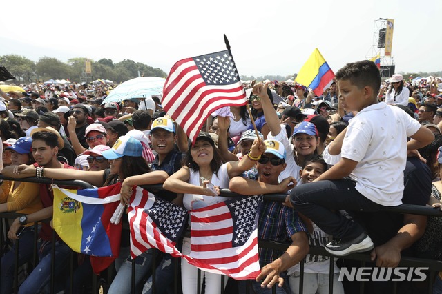 【쿠쿠타(콜롬비아)=AP/뉴시스】22일(현지시간) 콜롬비아 국경도시 쿠쿠타의 콜롬비아 측 티엔디타스 교량 근처에서 '베네수엘라 에이드 라이브' 콘서트가 열려 현장에 모인 군중이 미국과 베네수엘라 국기를 흔들고 있다.