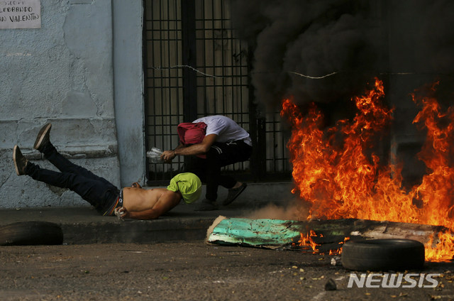 【우레나=AP/뉴시스】23일(현지시간)베네수엘라 우레나에서 시민과 군이 충돌한 가운데 시위 중인 남성들이 철조망에 걸려 넘어지고 있다.