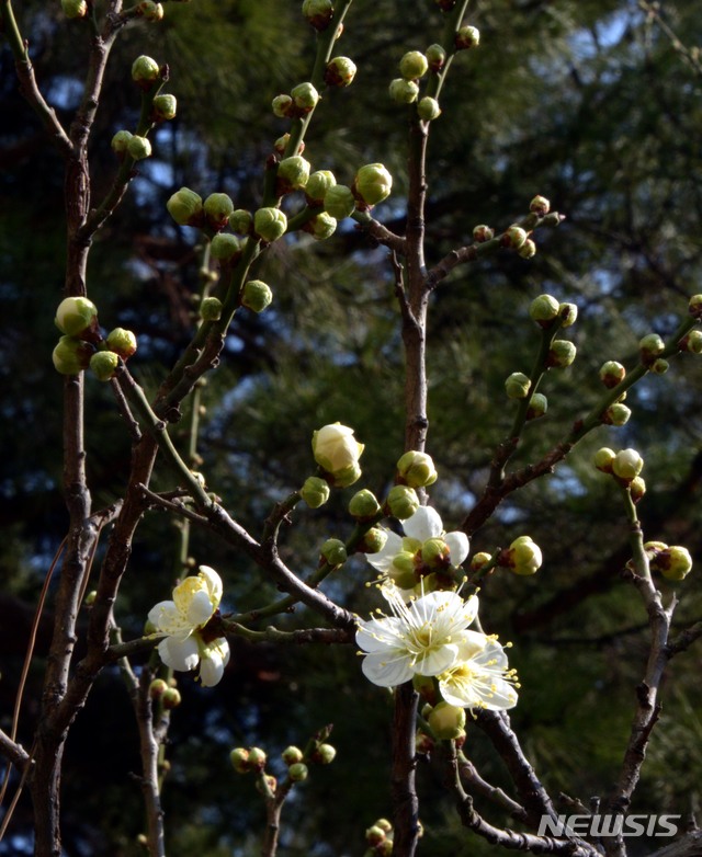 【성남=뉴시스】박태홍 기자 =  포근한 봄 날씨를 보인 24일 오후 경기 성남시 분당구 이매동 아파트 정원에서 봄의 전령 매화가 꽃봉오리를 맺혀 아름답다. 2019.02.24.