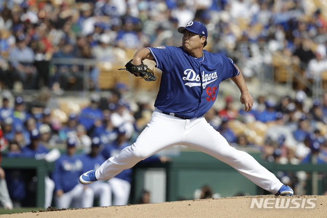 【글렌데일=AP/뉴시스】LA 다저스 류현진이 24일(현지시간) 미 애리조나주 글렌데일 캐멀백 랜치에서 열린 LA 에인절스와의 시범경기에 선발 등판해 투구하고 있다.