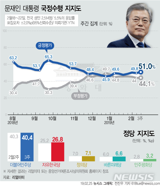 【서울=뉴시스】리얼미터가 YTN 의뢰로 2월 18일~22일 조사해 25일 공개한 2월 3주차 주간집계에 따르면 문재인 대통령의 지지율은 지난주 대비 1.2%p 오른 51.0%로 조사됐다. (그래픽=전진우 기자)