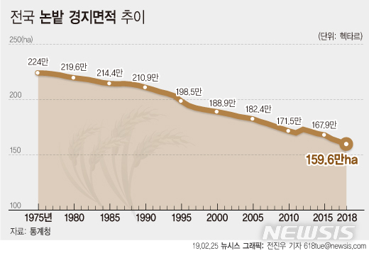 【서울=뉴시스】 25일 통계청이 발표한 '2018년 경지면적조사 결과’에 따르면 지난해 우리나라 경지 면적은 159만6000ha로 1년 전(162만1000ha)보다 2만5000ha(1.6%) 감소했다. (그래픽=전진우 기자)