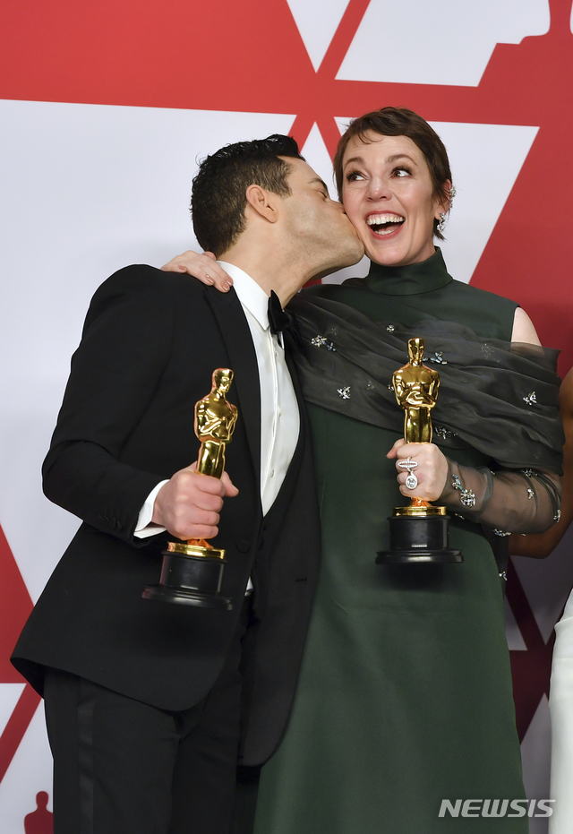 【로스앤젤레스=AP/뉴시스】24일(현지시간) 미 LA 돌비시어터에서 열린 ‘제91회 아카데미 시상식’에서 최우수 남우주연상을 받은 라미 말렉(왼쪽)이 프레스룸에서 기념촬영을 하며 최우수 여우주연상을 받은 올리비아 콜맨에게 축하 키스를 하고 있다.