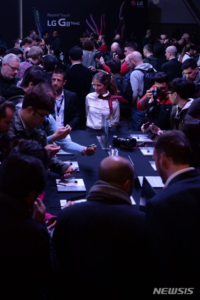 【서울=뉴시스】24일(현지시각) 스페인 바르셀로나 국제컨벤션센터에서 LG전자가 LG V50 ThinQ와 LG G8 ThinQ를 동시에 공개했다. 사진은 LG전자 신제품 공개행사장이 관람객들로 북적이는 모습. 2019.02.25. (사진=LG전자 제공)