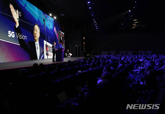 【바르셀로나(스페인)=뉴시스】최동준 기자 = 황창규 KT 회장이 25일(현지시간) 스페인 바르셀로나 피아그란비아에서 열린 MWC19(모바일 월드 콩그레스) 개막식 기조연설을 하고 있다. 2019.02.25.