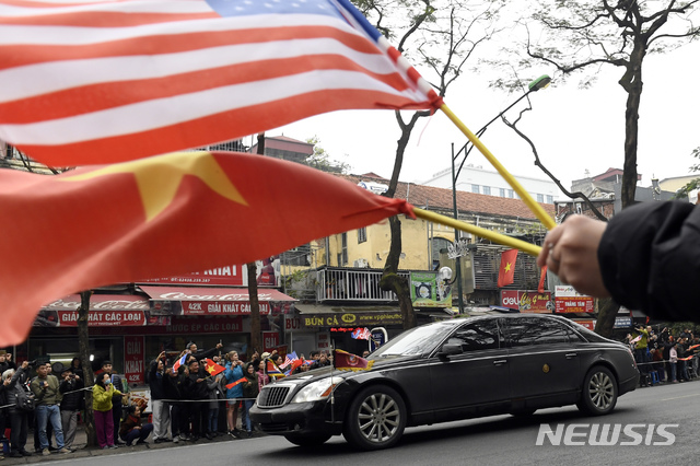 【하노이=AP/뉴시스】김정은 북한 국무위원장이 탑승한 차량이 26일(현지시간) 사이카의 호위를 받으며 베트남 하노이의 멜리아 호텔로 향하는 가운데 시민들이 환영하고 있다.