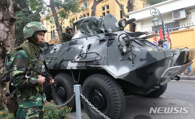 【하노이(베트남)=뉴시스】 전진환 기자 = 26일 오전(현지시각) 북미 정상회담을 위해 베트남을 방문하는 김정은 북한 국무위원장의 숙소로 유력한 베트남 하노이 멜리아 호텔 인근에 장갑차가 배치되어 있다. 2019.02.26.