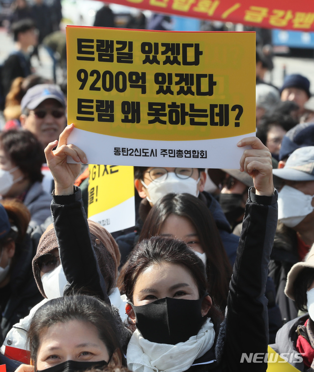 【세종=뉴시스】강종민 기자 = 경기 화성 동탄2신도시 주민들이 26일 오전 정부세종청사 국토교통부 앞에서 주민 총궐기 집회를 열고 교통불편 해소를 촉구하고 있다. 2019.02.26.