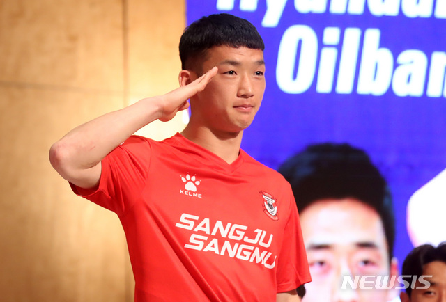 【서울=뉴시스】이영환 기자 = 26일 오전 서울 서대문구 그랜드힐튼호텔에서 열린 2019 하나원큐 K리그1 개막 미디어데이 기자회견에서 상주상무 김민우가 경례를 하고 있다. 2019.02.26.