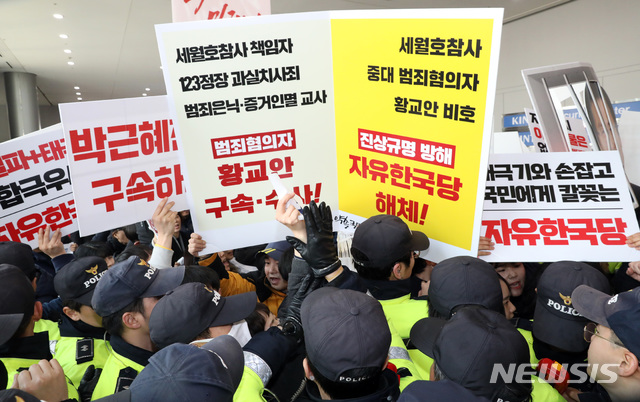 【고양=뉴시스】박영태 기자 = 27일 경기도 고양시 킨텍스에서 열린 자유한국당 제3차 전당대회장 앞에서 민주노총 노조원들이 자유한국당 해체를 주장하며 경찰과 대치하고 있다. 2019.02.27.