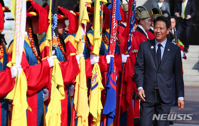 【서울=뉴시스】전신 기자 = 임종석 아랍에미리트 특임 외교 특별보좌관이 27일 청와대 대정원에서 열린 모하메드 빈 자이드 알 나흐얀 아랍에미리트(UAE) 왕세제 공식환영식에 참석하고 있다. 2019.02.27.