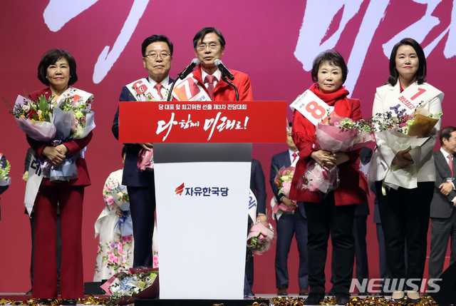 【고양=뉴시스】박영태 기자 = 27일 경기도 고양시 킨텍스에서 열린 자유한국당 제3차 전당대회에서 최고위원으로 당선된 조경태 최고위원이 당선 소감을 말하고 있다. 2019.02.27.