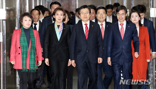 【서울=뉴시스】박영태 기자 = 28일 오전 서울 영등포구 여의도 국회에서 열린 자유한국당 최고위원회의에서 전날 전당대회에서 신임 당 대표로 당선된 황교안 대표가 첫 회의를 주재하기 위해 나경원 원내대표 및 지도부와 입장하고 있다. 2019.02.28.