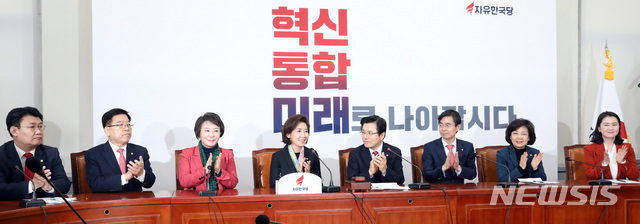 【서울=뉴시스】박영태 기자 = 28일 오전 서울 영등포구 여의도 국회에서 열린 자유한국당 최고위원회의에서 나경원 원내대표가 당 대표로 당선된 황교안 대표, 최고위원들과 함께 박수를 치고 있다. 2019.02.28.