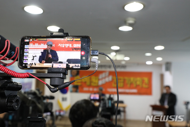 【서울=뉴시스】박미소 기자 = 한 유튜브 방송인이 28일 오전 서울 종로구 자유민주국민연합에서 열린 '손혜원 동생 손현씨의 비리 폭로 긴급 기자회견'을 생중계하고 있다.  2019.02.28.