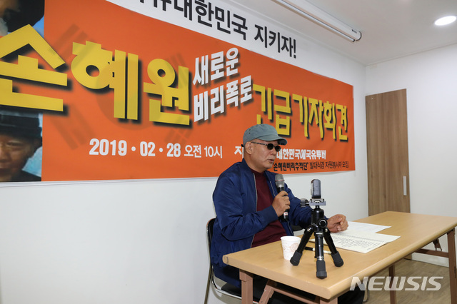 【서울=뉴시스】박미소 기자 = 손혜원 의원의 동생 손현씨가 28일 오전 서울 종로구 자유민주국민연합에서 열린 '손혜원 비리 폭로 긴급 기자회견'에서 발언하고 있다. 2019.02.28.