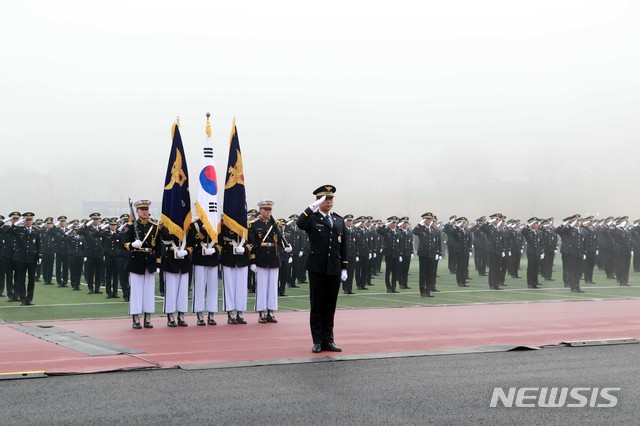 【서울=뉴시스】28일 충북 충주시 중앙경찰학교에서 열린 '중앙경찰학교 졸업식'에서 졸업생들이 경례를 하고 있다. 2019.02.28. (사진=경찰청 제공)