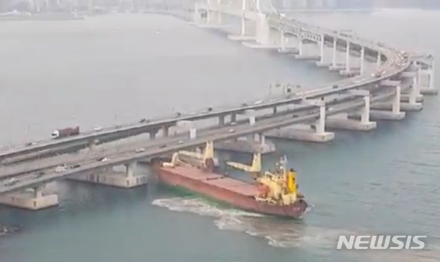 【서울=뉴시스】 이윤청 수습기자 = 28일 오후 4시23분께 부산 앞바다를 지나던 러시아 화물선 A호(6000t급)가 광안대교 하판을 들이받는 사고가 났다. 2019.02.28. (사진=KBS NEWS 캡처) [email protected]