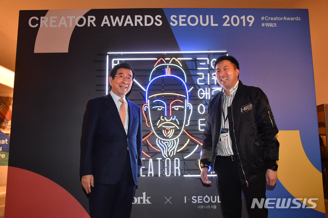 【서울=뉴시스】배훈식 기자 = 박원순 서울시장이 28일 서울 중구구 동대문디자인플라자에서 열린 크리에이터 어워즈 서울(Creator Awards Seoul) 2019에 참석, 매튜 샴파인 위워크 코리아 대표와 기념촬영을 하고 있다. 2019.02.28. (사진=서울시 제공)
