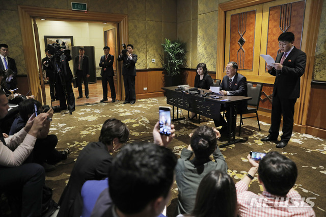 【하노이=AP/뉴시스】리용호 북한 외무상(오른쪽 앉은 사람)과 최선희 부상이 1일 새벽 베트남 하노이 멜리아 호텔에서 2차 북미 정상회담 결렬에 대한 북측 입장을 밝히고 있다. 2019.03.01