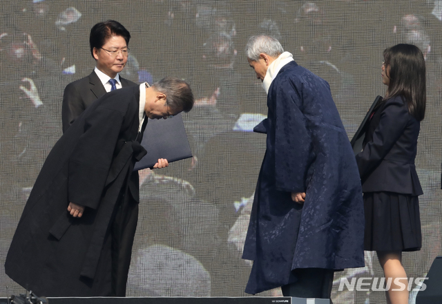 【서울=뉴시스】최진석 기자 = 문재인 대통령이 1일 서울 광화문광장에서 열린 제100주년 3.1절 기념식에서 고 유관순 열사에 대한 건국훈장 대한민국장을 조카 유장부씨에게 수여하며 인사를 하고 있다. 2019.03.01.