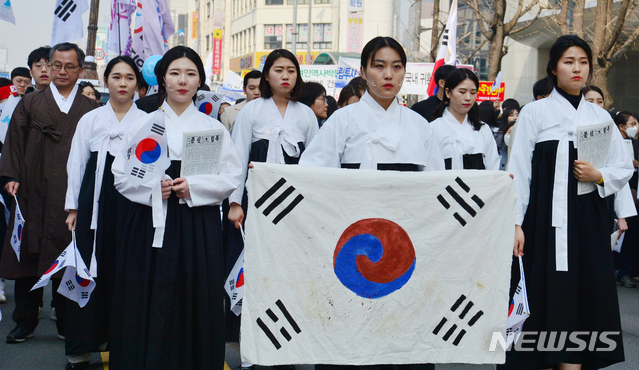 【광주=뉴시스】변재훈 기자 = 3·1운동 100주기인 1일 오전 광주시민들이 금남로와 5·18민주광장 일원에서 독립만세 함성을 재현하는 3·1 만세대행진을 펼치고 있다. 2019.03.01.
