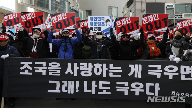 【서울=뉴시스】박미소 수습기자 = 대한애국당을 비롯한 태극기집회 참가자들이 1일 오후 서울 용산구 서울역에서 열린 '3·1운동 100주년 구국투쟁' 집회에서 피켓시위를 하고 있다. 2019.03.01.