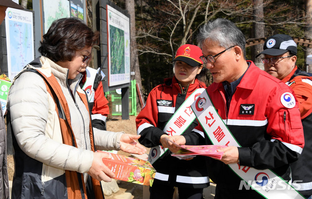 【서울=뉴시스】 추상철 기자 =김재현 산림청장이 2일 강원도 평창군 오대산 월정사 입구에서 유관기관 합동으로 열린 '봄철 산불예방 캠페인'에서 등산객들에게 홍보물품을 나눠주며 산불예방을 당부하고 있다. 2019.03.02. (사진= 산림청 제공)