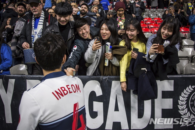 【밴쿠버=AP/뉴시스】밴쿠버 화이트캡스의 황인범이 2일(현지시간) 캐나다 밴쿠버 BC플레이스에서 열린 MLS 개막전 미네소타 유나이티드와의 경기를 마치고 팬들과 인사하고 있다. 2019.03.03.