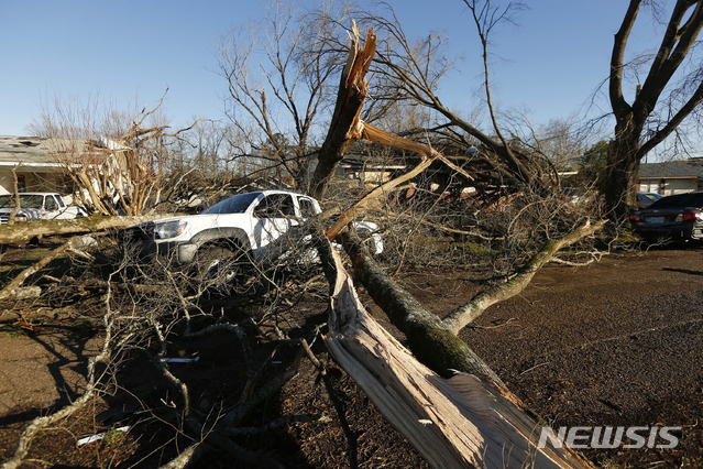 【콜럼버스(미 미시시피주)=AP/뉴시스】지난달 24일 미 미시시피주 콜럼버스에서 토네이도로 쓰러진 나무들이 자동차를 덮치는 등 큰 피해가 발생했다. 미 남부 앨라배마주 리 카운티에서는 3일 2개의 토네이도로 최소 14명이 목숨을 잃었다고 리 카운티의 제이 존스 보안관이 밝혔다. 2019.3.4