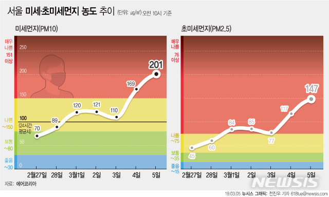 【서울=뉴시스】5일 서울의 미세먼지(PM-10) 농도는 오전 10시 기준 ’매우 나쁨' 수준인 201㎍/㎥를 기록했다. 초미세먼지(PM-2.5) 농도도 147㎍/㎥로 '매우나쁨' 수준이다. (그래픽=전진우 기자)