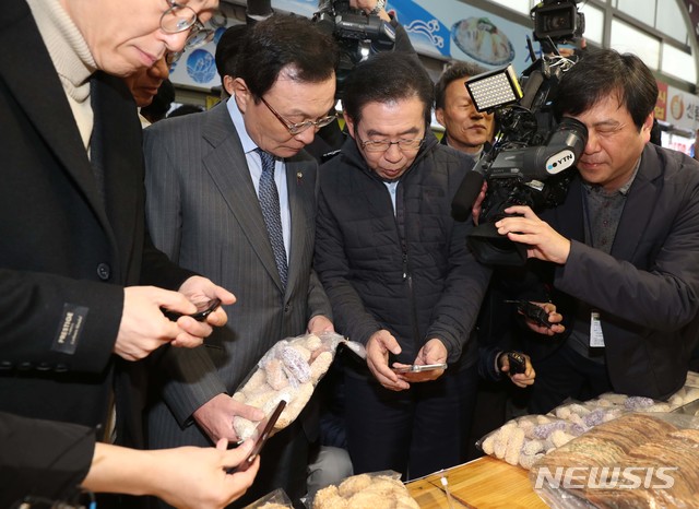 【서울=뉴시스】박주성 기자 = 더불어민주당 이해찬 대표와 박원순 서울시장이 5일 오전 '제로페이' 모범단지인 서울 관악구 신원시장을 방문해 한 상가에서 제로페이를 이용해 물건을 사고 있다.