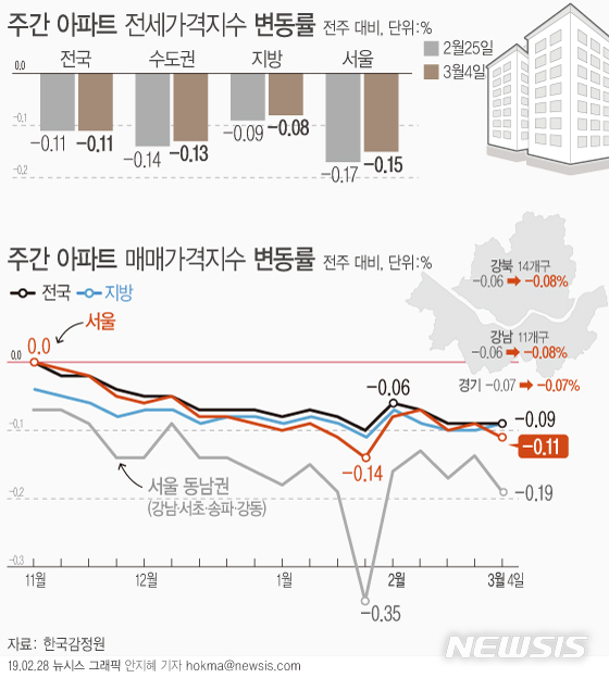 【서울=뉴시스】 7일 한국감정원에 따르면 지난 4일 기준 서울 아파트 매매가격은 0.11% 하락하며 지난 11월 둘째 주 이후 약세가 이어지고 있다. (그래픽=안지혜 기자)