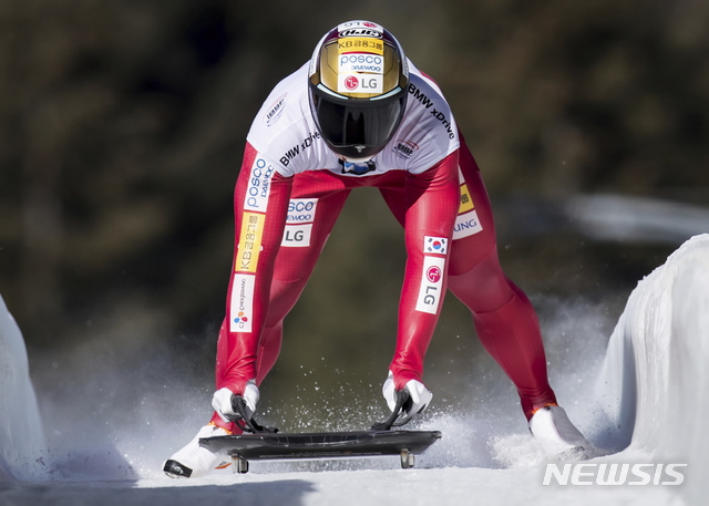 【휘슬러(캐나다)=AP/뉴시스】윤성빈이 8일(현지시간) 캐나다 휘슬러에서 열린 2018-2019 국제봅슬레이스켈레톤연맹(IBSF) 세계선수권 남자 스켈레톤 둘째 날 경기를 하고 있다.