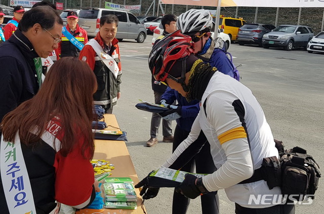 【춘천=뉴시스】한윤식 기자 = 9일 오전 강원도와 산림청 등 5개 유관기관 관계자들이 춘천시 남산면 구곡폭포 입구에서 등산객들에게 산불조심 문구가 새겨진 에코백 등을 나눠주며 산불예방 홍보 캠페인을 벌이고 있다. 2019.03.09.