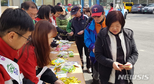 【춘천=뉴시스】한윤식 기자 = 9일 오전 강원도와 산림청 등 5개 유관기관 관계자들이 춘천시 남산면 구곡폭포 입구에서 등산객들에게 산불조심 문구가 새겨진 에코백 등을 나눠주며 산불예방 홍보 캠페인을 벌이고 있다. 2019.03.09.