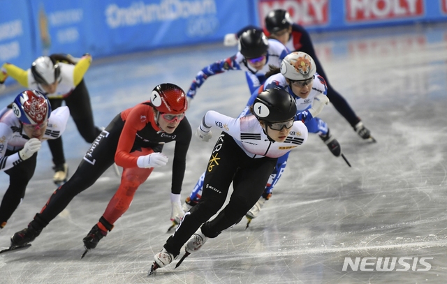 【소피아=AP/뉴시스】최민정(1)이 9일(현지시간) 불가리아 소피아에서 열린 2018-2019시즌 국제빙상경기연맹(ISU) 세계쇼트트랙선수권대회 여자 1500m 결승에서 선두로 경기하고 있다.
