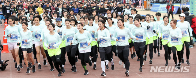 【서울=뉴시스】김선웅 기자 = 10일 서울 송파구 잠실종합운동장에서 열린 '서울 위대한 페스티벌 5km 마라톤' 참가자들이 힘차게 출발하고 있다. 2019.03.10. [email protected]