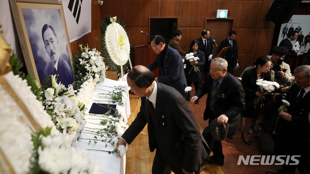 【서울=뉴시스】추상철 기자 =도산 안창호 선생 서거 81주기 추모식이 열린 10일 오전 서울 강남구 도산안창호기념관에서 참석자들이 헌화하고 있다. 2019.03.10.