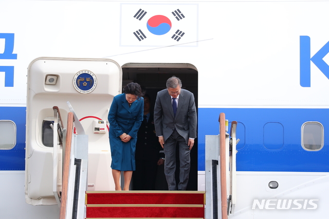 【성남=뉴시스】전신 기자 = 아세안 3개국 순방에 나서는 문재인 대통령과 부인 김정숙 여사가 10일 경기도 성남 서울공항에서 공군1호기에 탑승하면서 고개숙여 인사를 하고 있다. 2019.03.10.