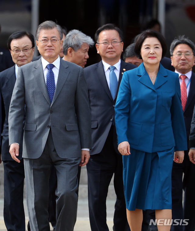 【성남=뉴시스】전신 기자 = 아세안 3개국 순방에 나서는 문재인 대통령과 부인 김정숙 여사가 10일 경기도 성남 서울공항에서 공군1호기에 탑승하기 위해 이동하고 있다. 2019.03.10.